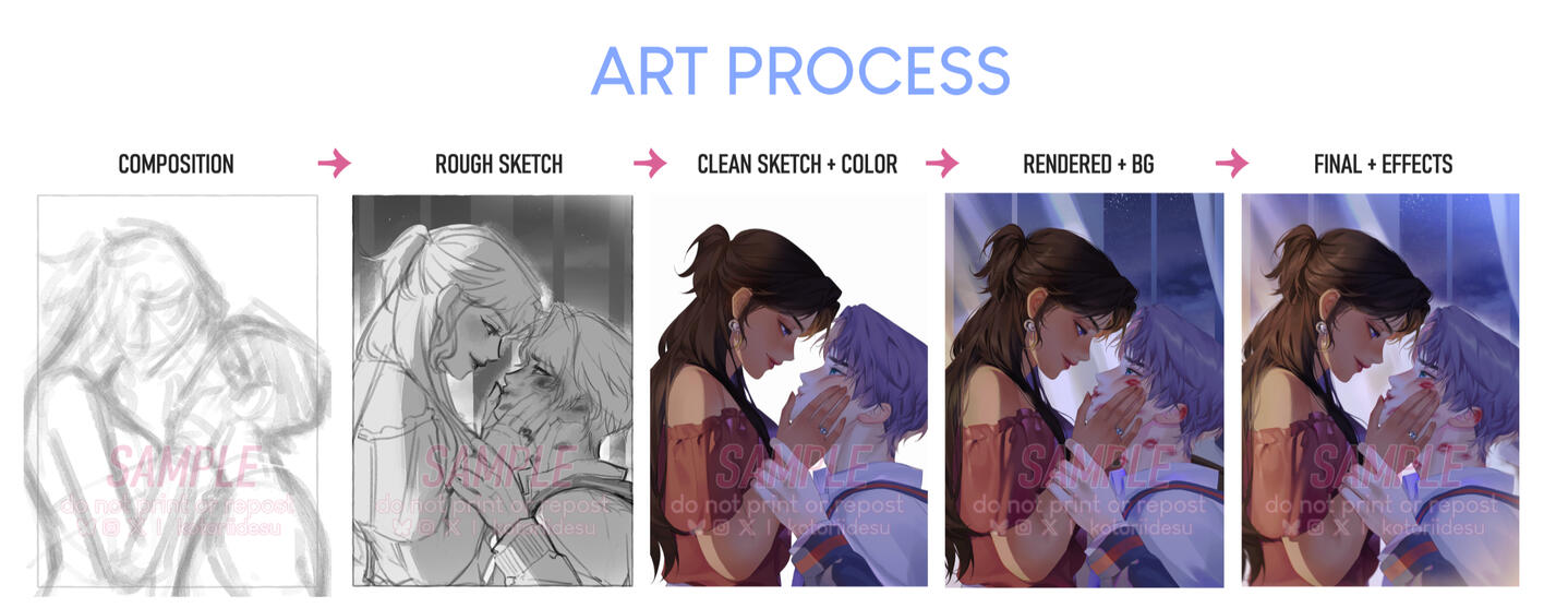 Fully rendered illustrations may have the character/s in either half-body or full-body. Clients may choose their preferred canvas orientation: portrait and landscape.Recommended if you want an illustration of your character/s in a full atmospheric environment.If you wish to order this type, please be prepared to wait for 1-3 months for completion.Extra fee applies for:🐣 Additional Character/s +50% to 70%
